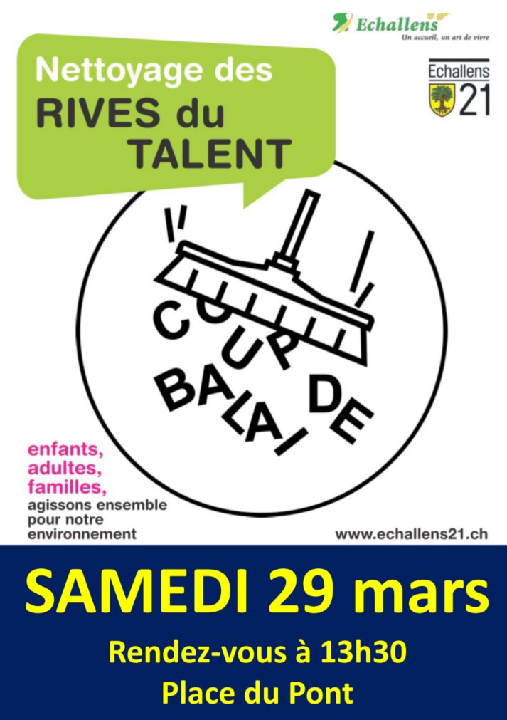 Rendez-vous Samedi 30 mars, à 13h30 à la place du Pont pour le 6ème coup de balai organisé par Echallens 21 en collaboration avec la commune d'Echallens.